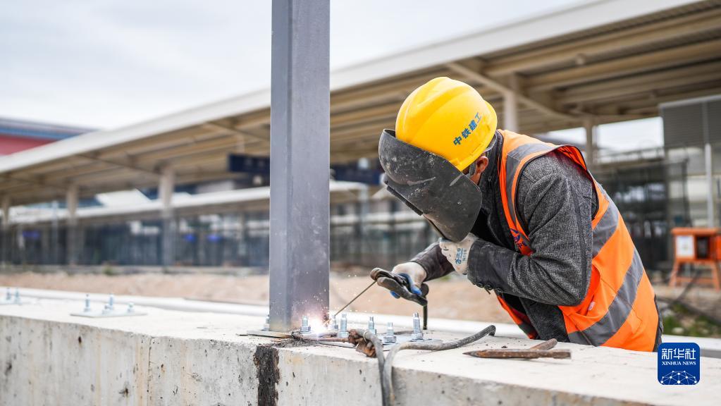 5月1日,中铁建工集团工人在贵州贵安新区贵安站扩建项目工地施工。