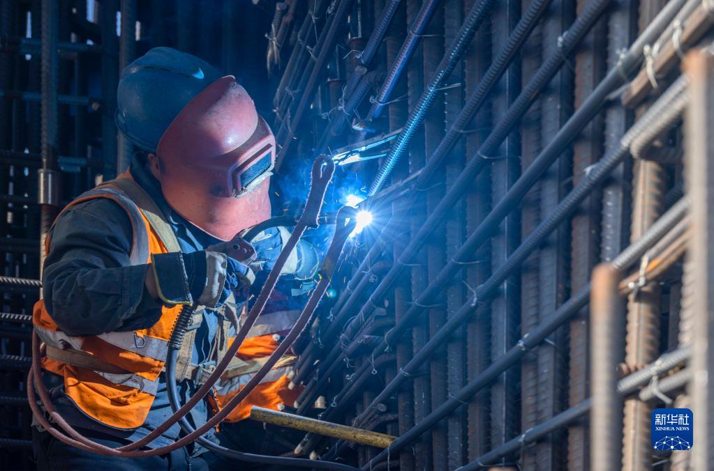5月1日,中交二航局工人在江苏常泰长江大桥5号墩主塔进行焊接作业。