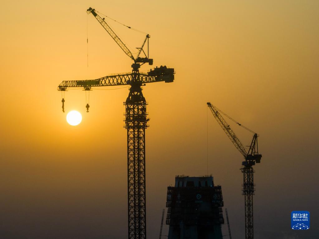 5月1日,中交二航局的工人在江苏常泰长江大桥建设项目施工现场作业(无人机照片)。
