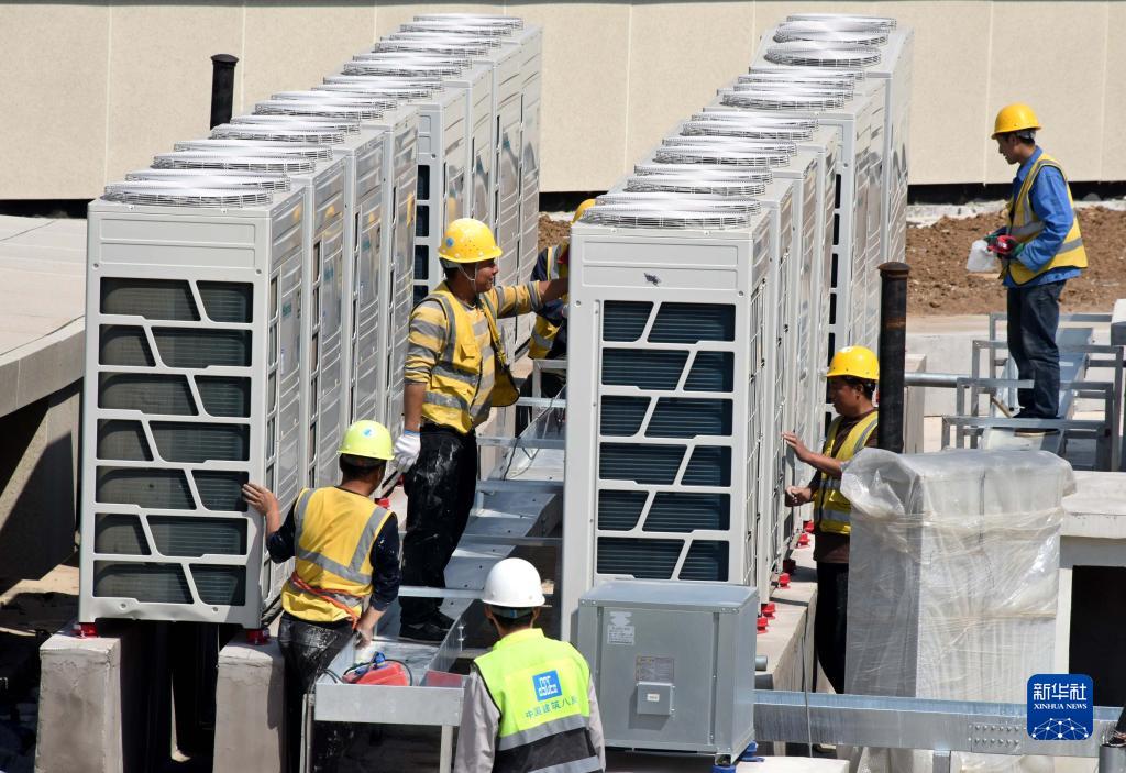 5月1日,中建八局四公司的工人在山东省青岛市高新区康复大学项目工地施工。