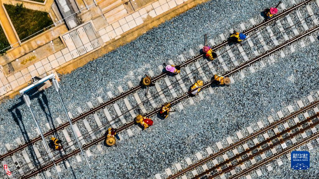 5月1日,中国铁路南宁局集团有限公司南宁工务段贵南高铁轨道精调组的工人在贵南高铁南宁枢纽有砟路段整理道床(无人机照片)。