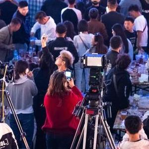 4月29日,在淄博烧烤街,来自全国各地的摄影师在拍摄烧烤节。