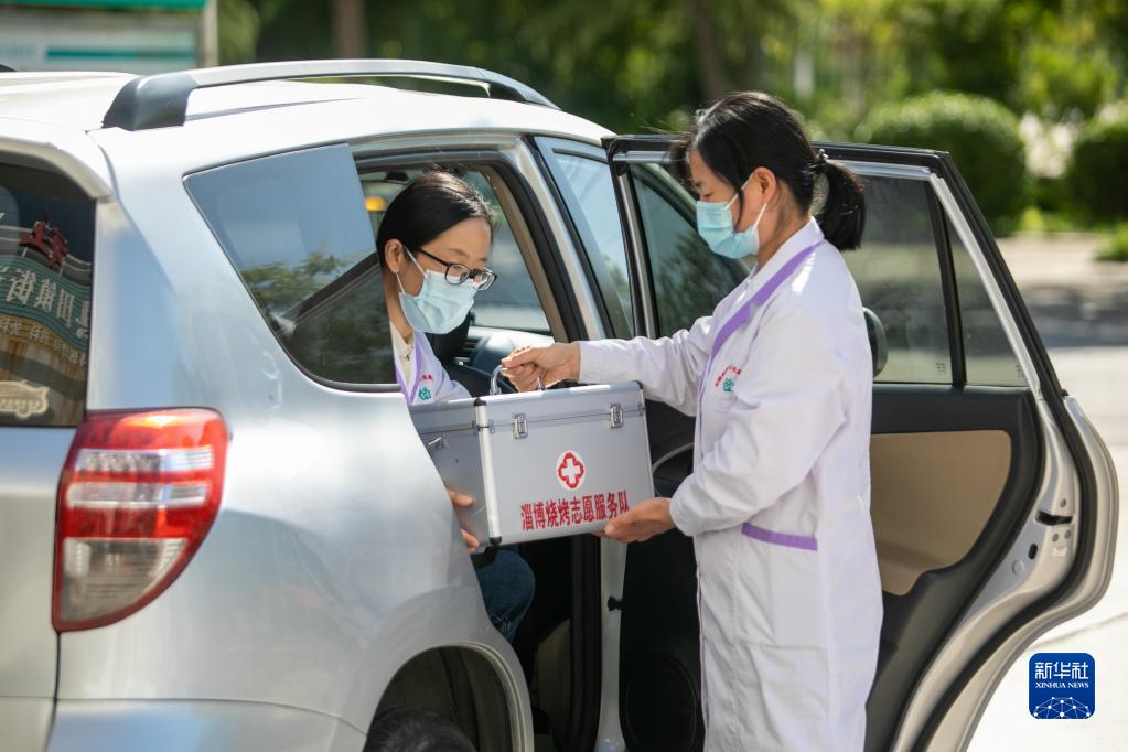 4月30日,在淄博市高青县田镇街道,志愿者备好常用药品准备乘车前往一个烧烤服务点工作。