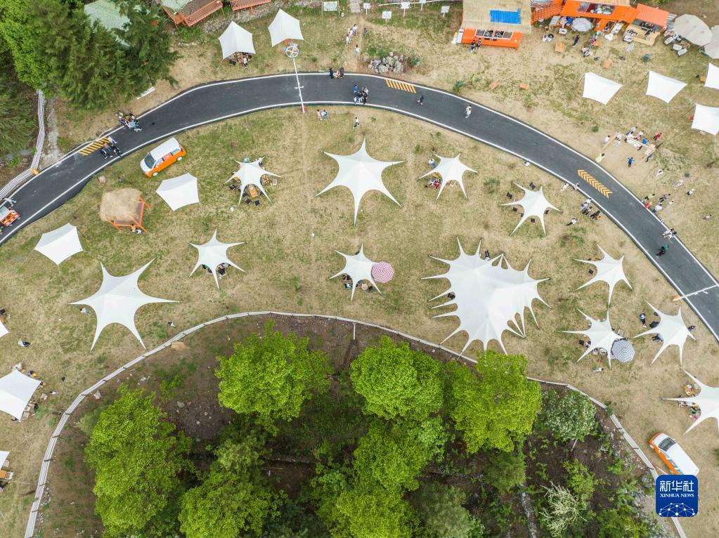 5月1日,游客在贵州省毕节市赫章县硐上村游玩(无人机照片)。