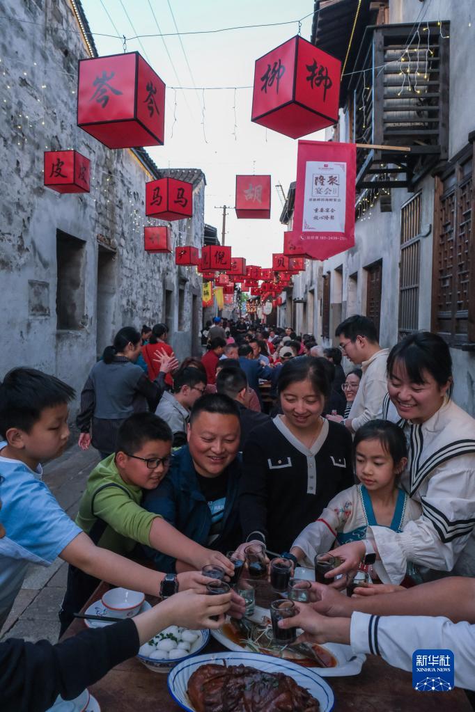 5月1日,在浙江嘉兴桐乡市崇福镇运河文化历史街区的横街上,游客参加古镇特色长街宴。