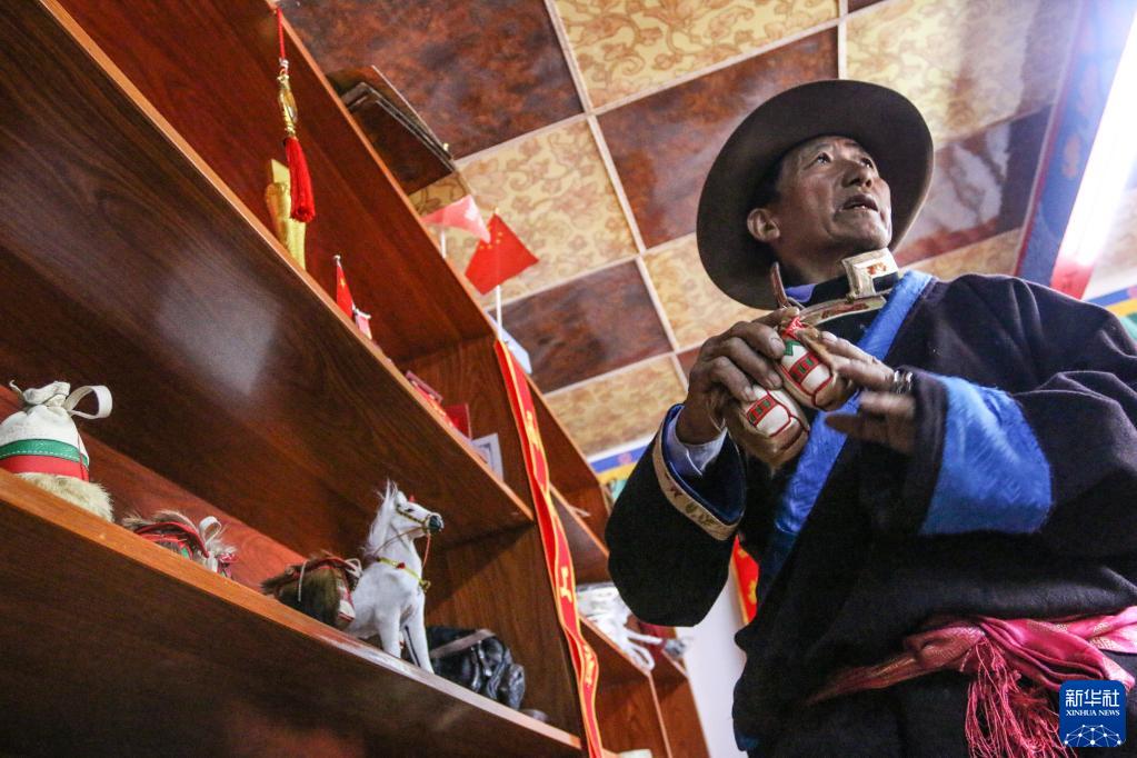 索朗群培展示他制作的工艺品马包(4月18日摄)。