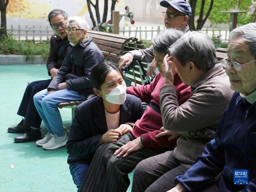 4月28日,在上海市杨浦区社会福利院,养老护理员胡小芳陪晒太阳的老年人聊天。