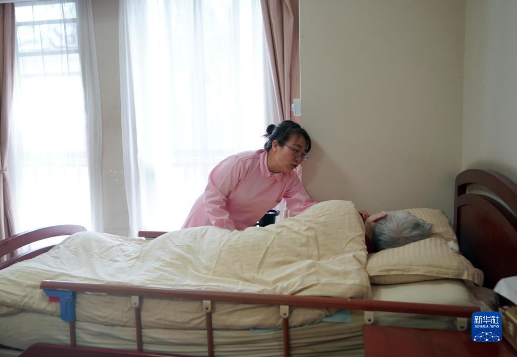 4月28日,在上海市杨浦区社会福利院,护理主管张智萍在照料卧床的老年人。