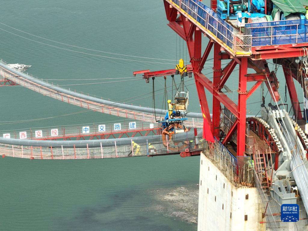 工人在广西龙门大桥项目建设工地进行主缆紧缆施工(5月1日摄,无人机照片)。