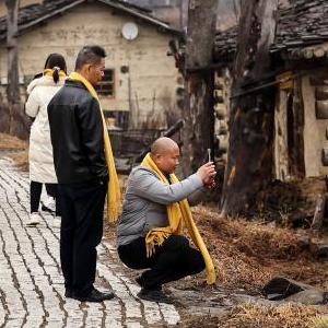 锦江木屋村一栋木屋外悬挂的灯笼、玉米和辣椒(2023年4月6日摄)。