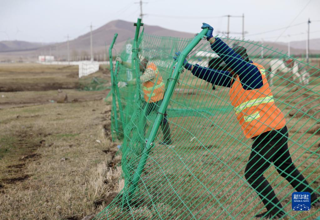 5月2日,河北省承德市丰宁满族自治县大滩镇扎拉营村的护林员赵世海(右)和罗金宝在海留图国家湿地公园修复护栏。
