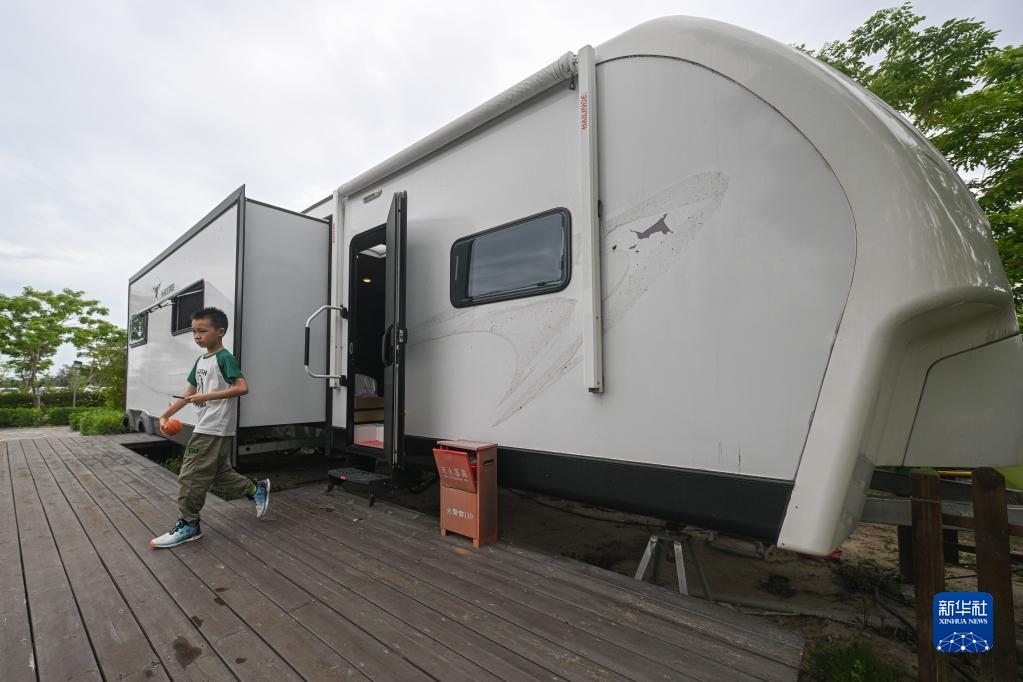 5月1日,游客在海南花梨谷文化旅游区房车庭院玩耍(无人机照片)。