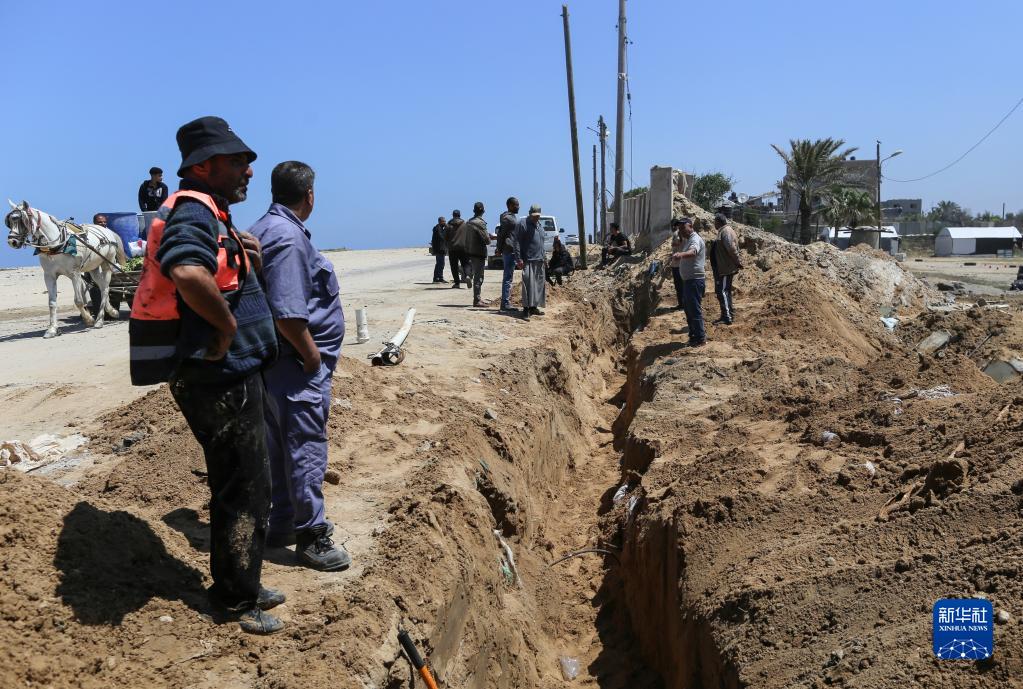5月3日,人们在加沙地带城市代尔拜拉赫查看一处以色列军队空袭地点。