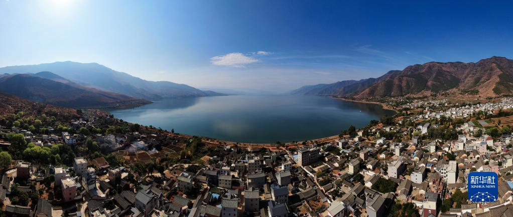云南省丽江市永胜县的程海湖似一颗蓝宝石镶嵌在大地上(5月1日摄,无人机全景照片)。