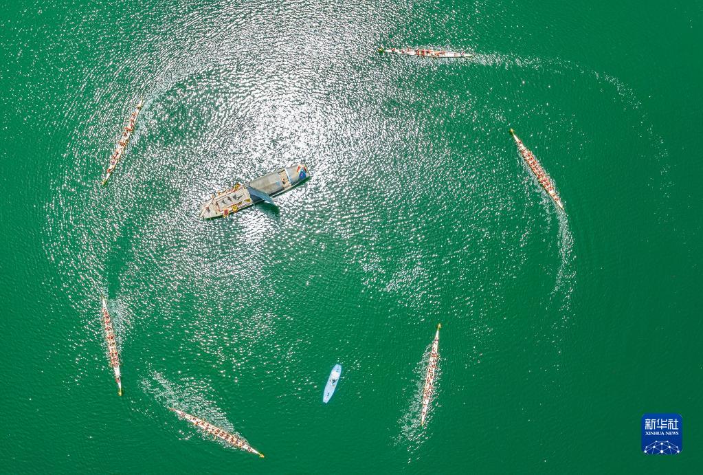 5月1日,湖北省宜昌市秭归县归州镇万古寺村村民与游客共同划龙舟(无人机照片)。