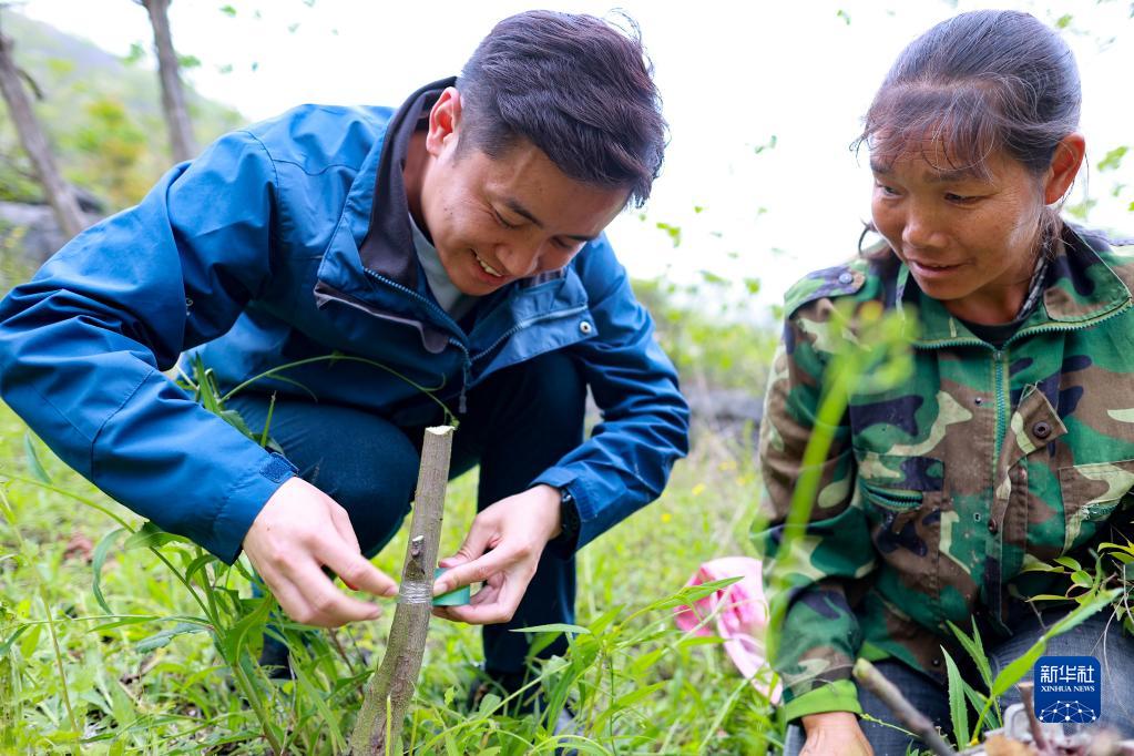 杨安仁(左)和工人在油桐种植基地嫁接树苗(4月17日摄)。