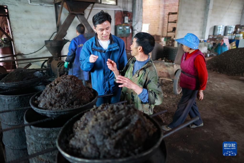 杨安仁(前左)和工人交流油桐榨油工序(4月17日摄)。
