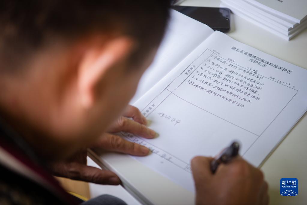 4月29日,在石首麋鹿国家级自然保护区,巡护员刘吉高填写巡护日志。