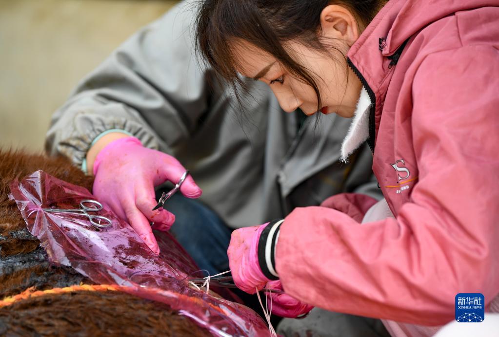 白婳在固原市原州区开城镇双泉村为村民李百武的一头牛缝合伤口(4月18日摄)。