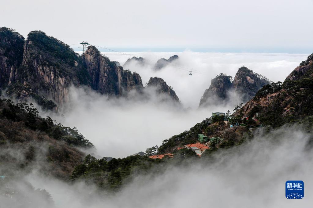 2021年3月10日拍摄的云雾中的黄山北海一带美景。