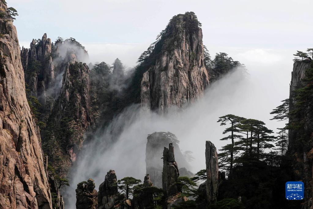 2021年3月10日,黄山卧云峰出现瀑布流云景象。