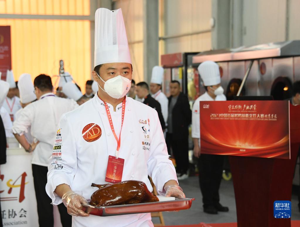 夏志鹏在2023中国首届烤鸭技能烹饪大赛中端着烤制完成的烤鸭(4月24日摄)。