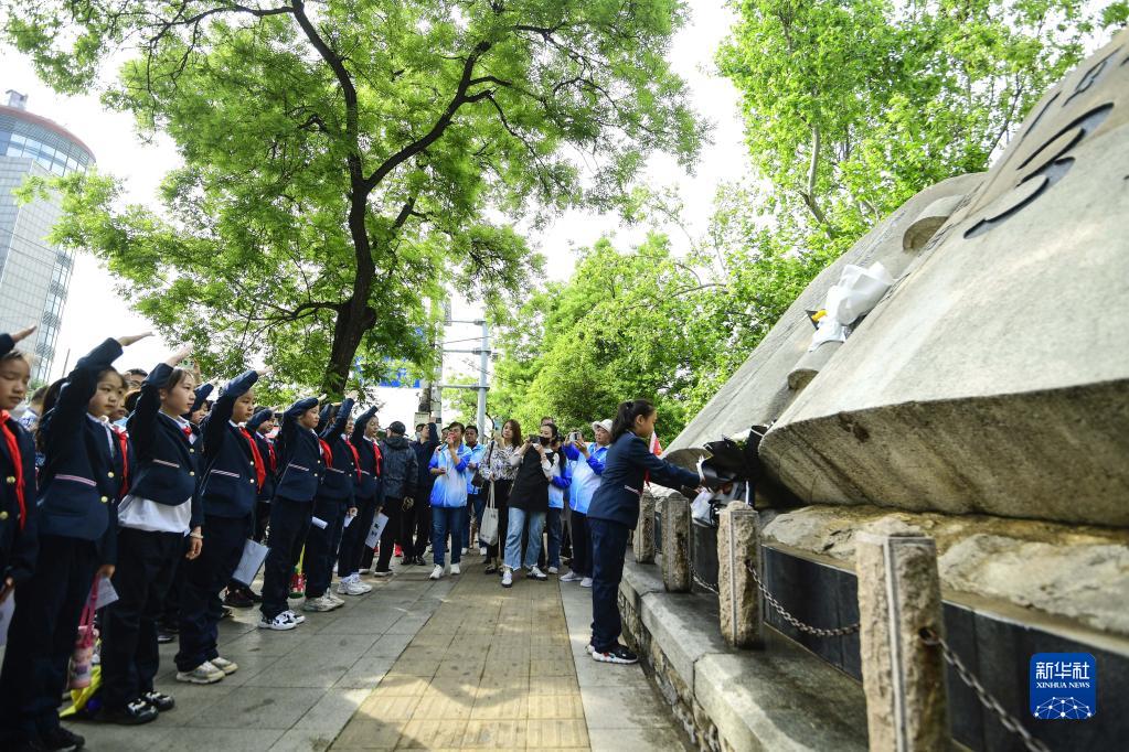 5月3日,小学生在“五三惨案”纪念碑前献花。