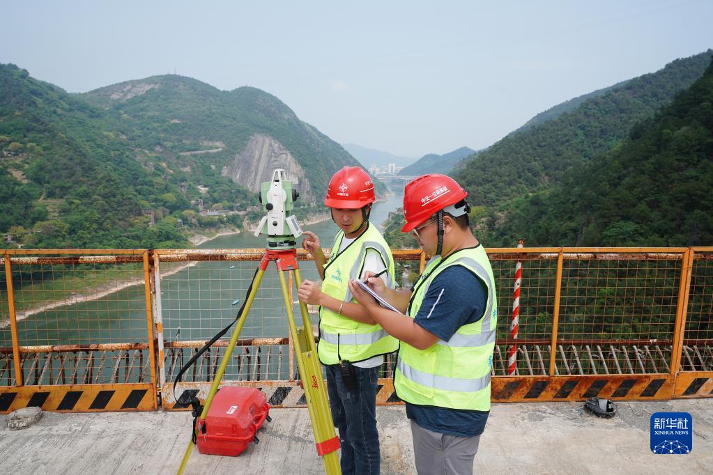 5月4日,在重庆市北碚区渝武高速复线观音峡嘉陵江特大桥,中交一公局四公司桥梁工区工作人员孙培耕(右)和彭昭屏在对桥面高程及轴线偏位进行测量。