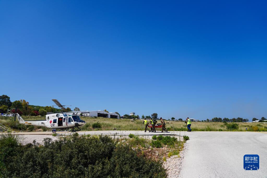 5月3日,在黎巴嫩南部边境“蓝线”附近雷场,参与演习的中国第21批赴黎巴嫩维和多功能工兵分队队员使用救援直升机转运“伤员”。新华社发(李竹林摄)