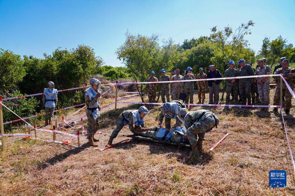 5月3日,在黎巴嫩南部边境“蓝线”附近雷场,参与演习的中国第21批赴黎巴嫩维和多功能工兵分队队员将“伤员”抬到担架上。新华社发(李竹林摄)