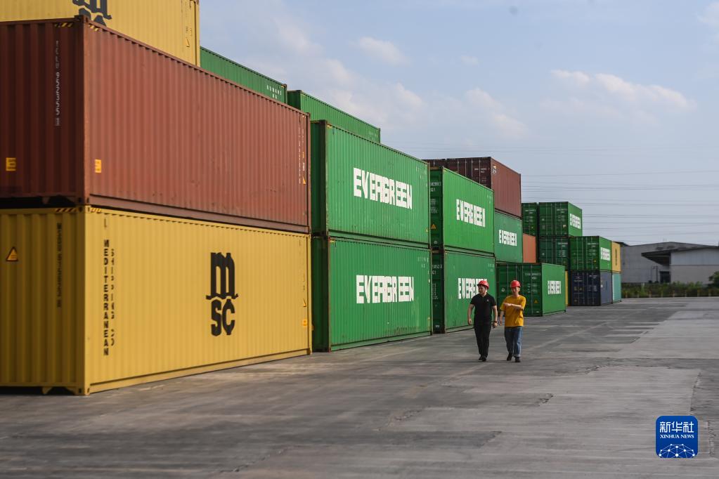 5月4日,诸暨市财政部门工作人员(左)到海铁联运中心查看外贸货物运输情况。