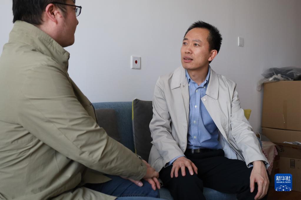4月12日,曹云山(右)在肺动脉高压疾病患者家里走访。