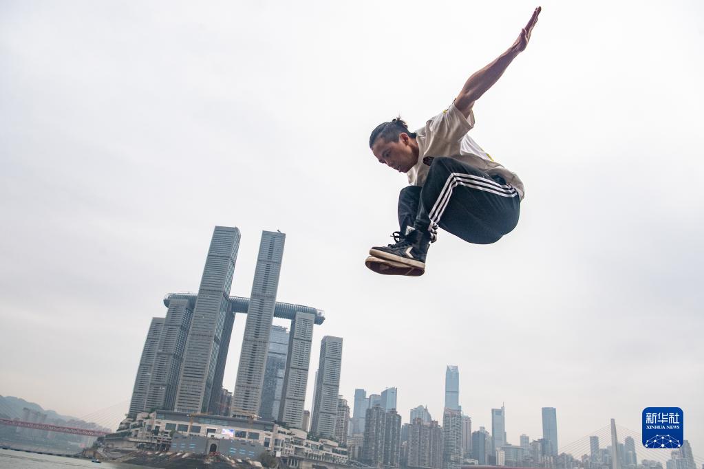 2023年4月21日,重庆跃飞跑酷队员文舜尧在重庆朝天门对岸的江滩上展示跑酷动作。