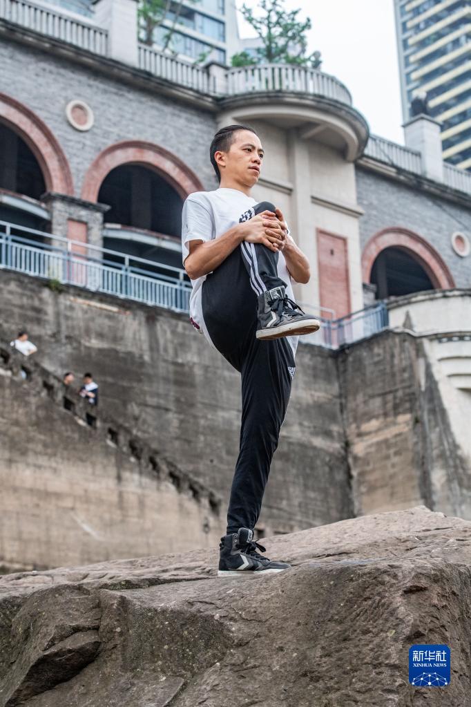 2023年4月21日,重庆跃飞跑酷队员文舜尧在重庆朝天门对岸的江滩上进行热身运动。