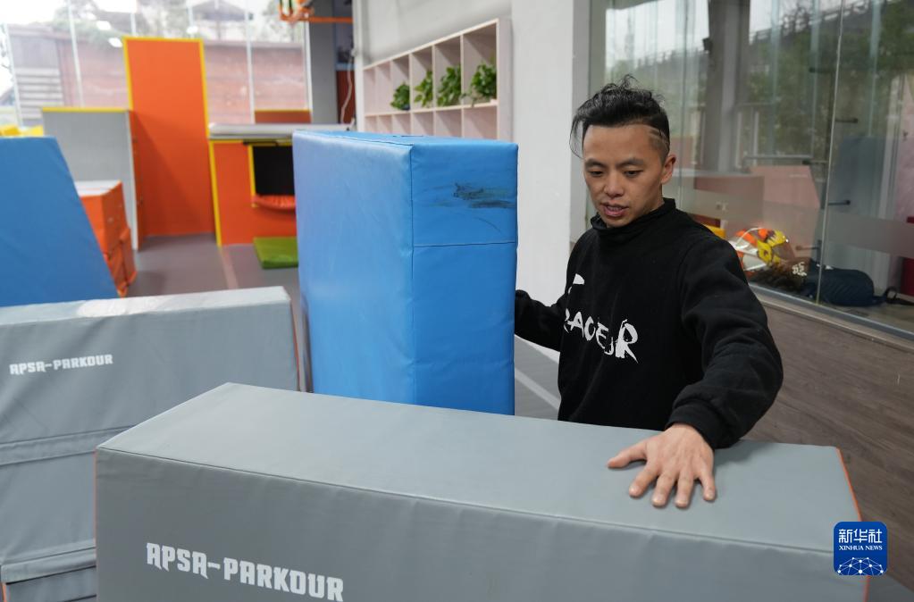 2023年2月23日,文舜尧在重庆跃飞跑酷俱乐部内摆放训练器材。