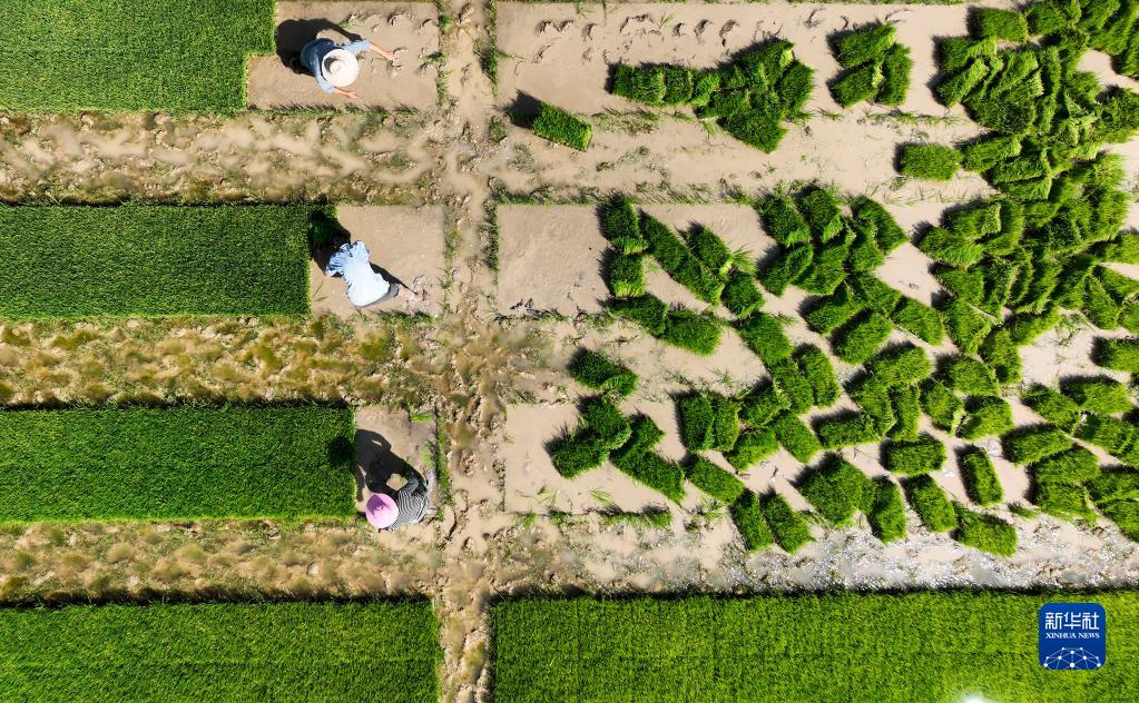 5月5日,农民在四川省南充市蓬安县睦坝镇虹管村稻田里起秧(无人机照片)。