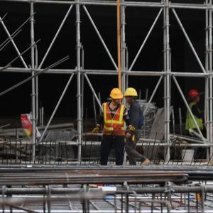 5月5日,在广州黄埔区的中山大学附属第三医院岭南医院二期项目,工人在捆扎钢筋。