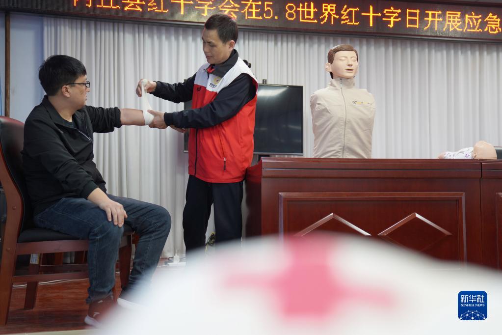 5月5日,学员在内丘县红十字会培训教室学习外伤包扎知识。