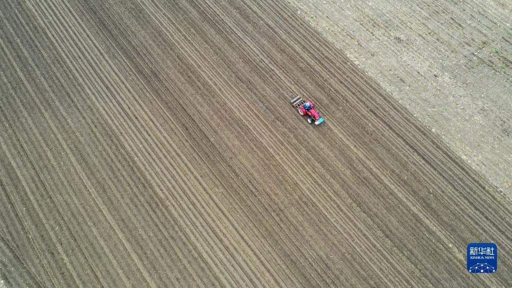 5月5日,在吉林省长春市九台区龙嘉街道水乡村,农民驾驶农机进行春耕作业(无人机照片)。