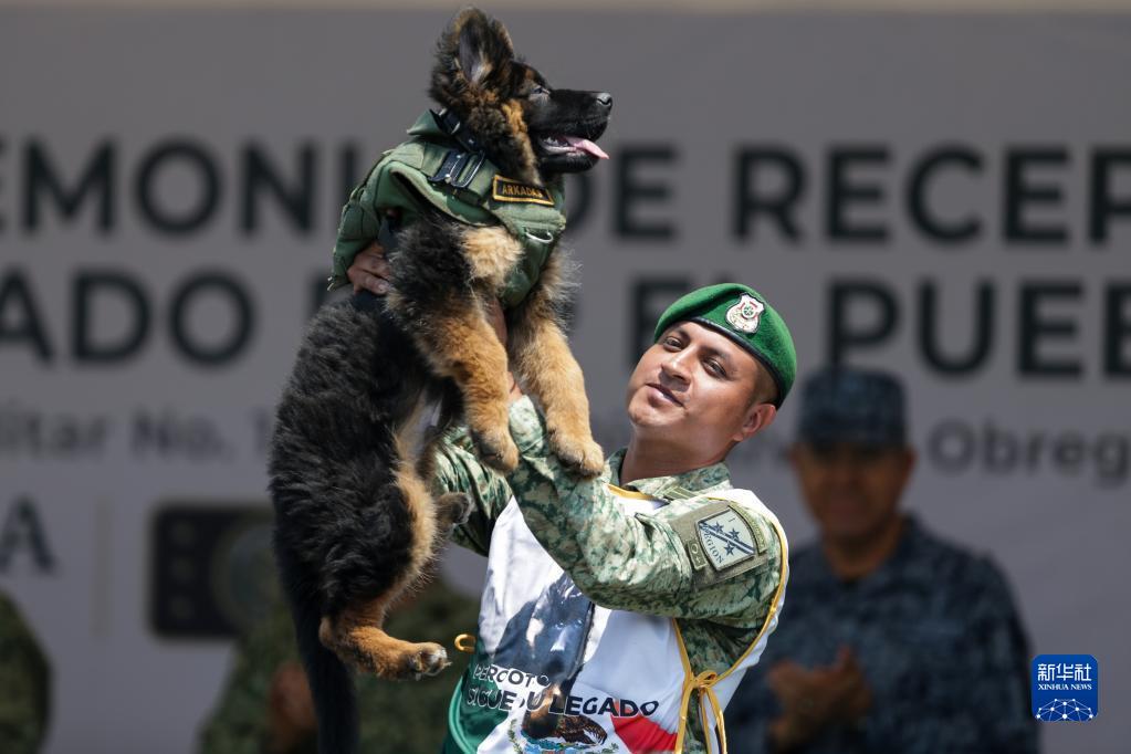 5月3日,在墨西哥瑙卡尔潘一处军事基地,训导员抱着土耳其赠送的小狗。
