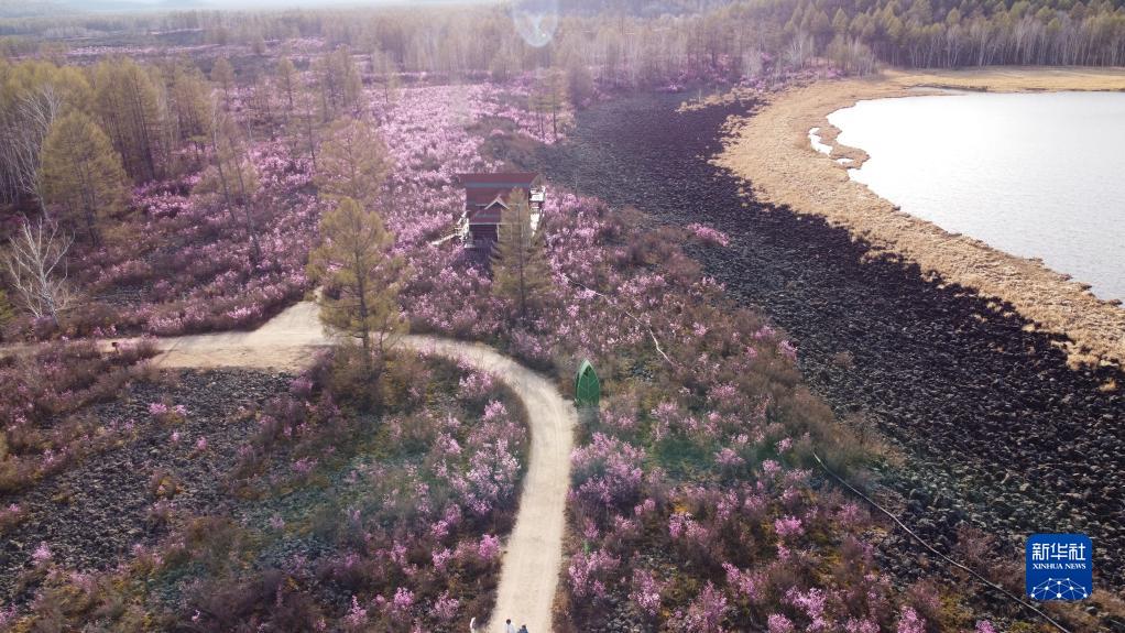近日,内蒙古呼伦贝尔市鄂伦春自治旗达尔滨湖国家森林公园的杜鹃竞相绽放,进入观赏期。