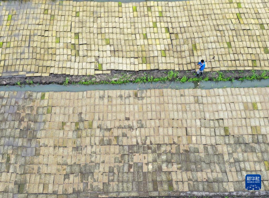 5月6日,在安徽省巢湖市中垾镇宏扬家庭农场,农民在摆满秧盘的秧田里查看秧苗长势(无人机照片)。