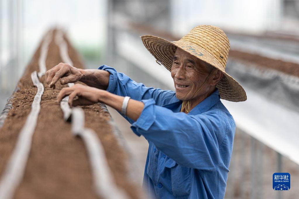 5月6日,农户在浙江省湖州市吴兴区八里店镇移沿山村一座未来农场铺设滴灌系统,为育苗做准备。