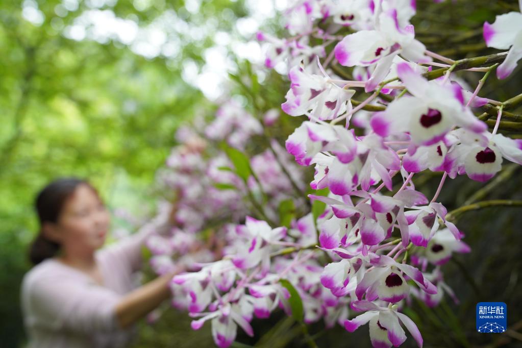 5月6日,农民在贵州省赤水市复兴镇风溪村采摘金钗石斛鲜花。
