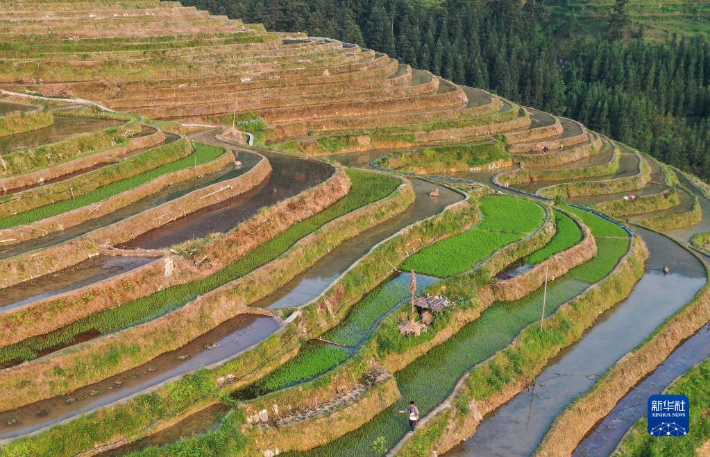 5月6日,农民在贵州省从江县加榜乡加页村的梯田劳作(无人机照片)。