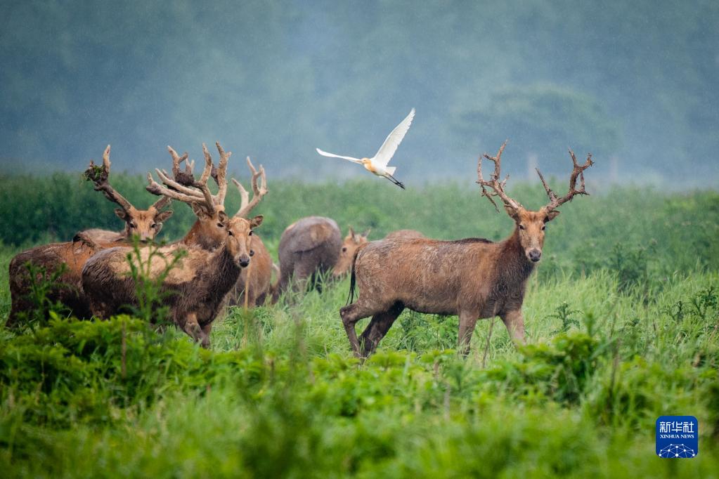 4月28日,一群麋鹿在湖北石首麋鹿国家级自然保护区活动。