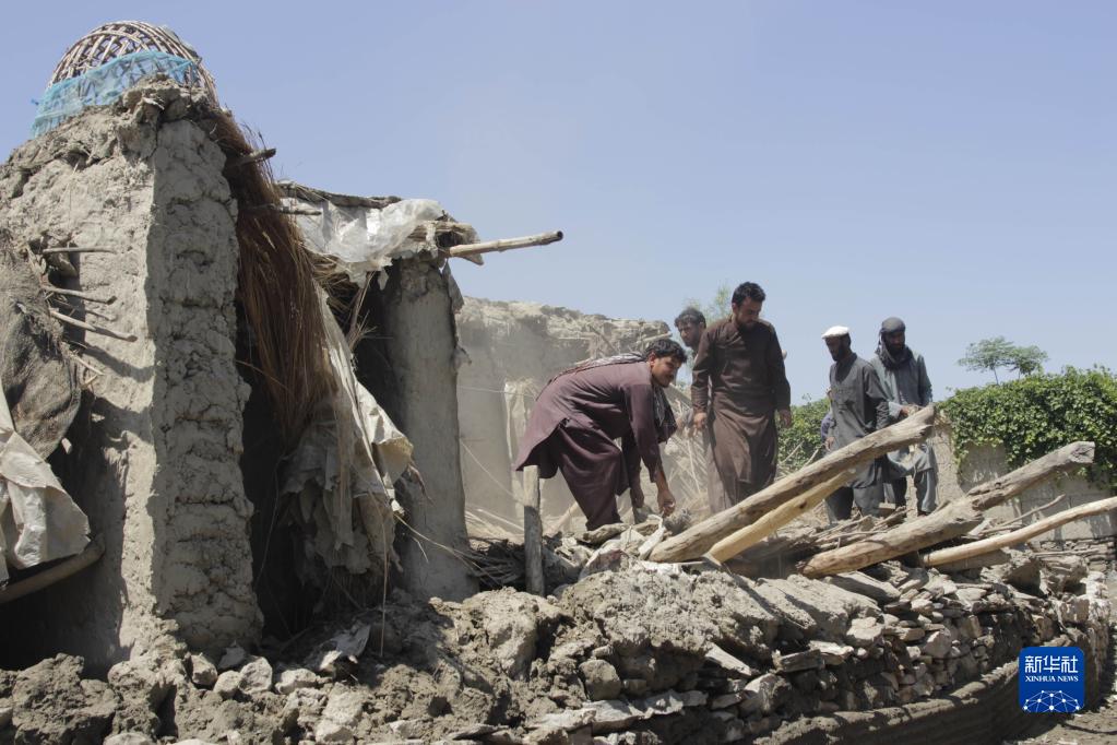 5月6日,人们在阿富汗楠格哈尔省清理遭强降雨和洪水损毁的房屋废墟。