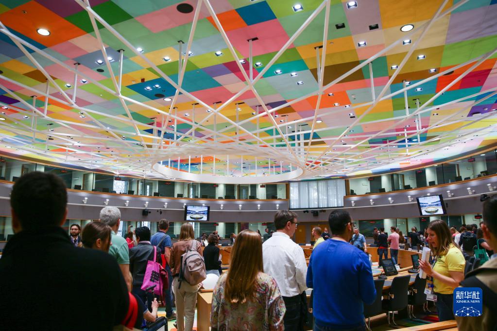 5月6日,在比利时布鲁塞尔,人们在欧盟理事会办公大楼参观会议室。