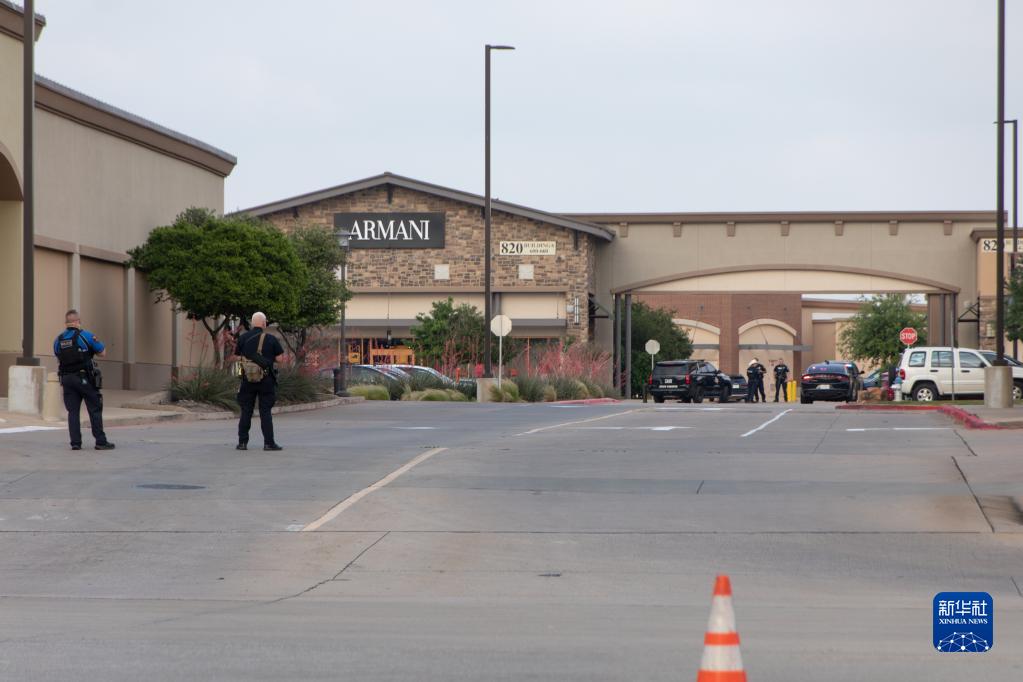 这是5月6日在美国得克萨斯州达拉斯近郊发生枪击事件的购物中心拍摄的警察和警车。