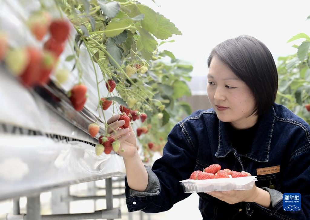 5月7日,游客在江苏省扬州市江都区现代农业产业园大棚内采摘草莓。